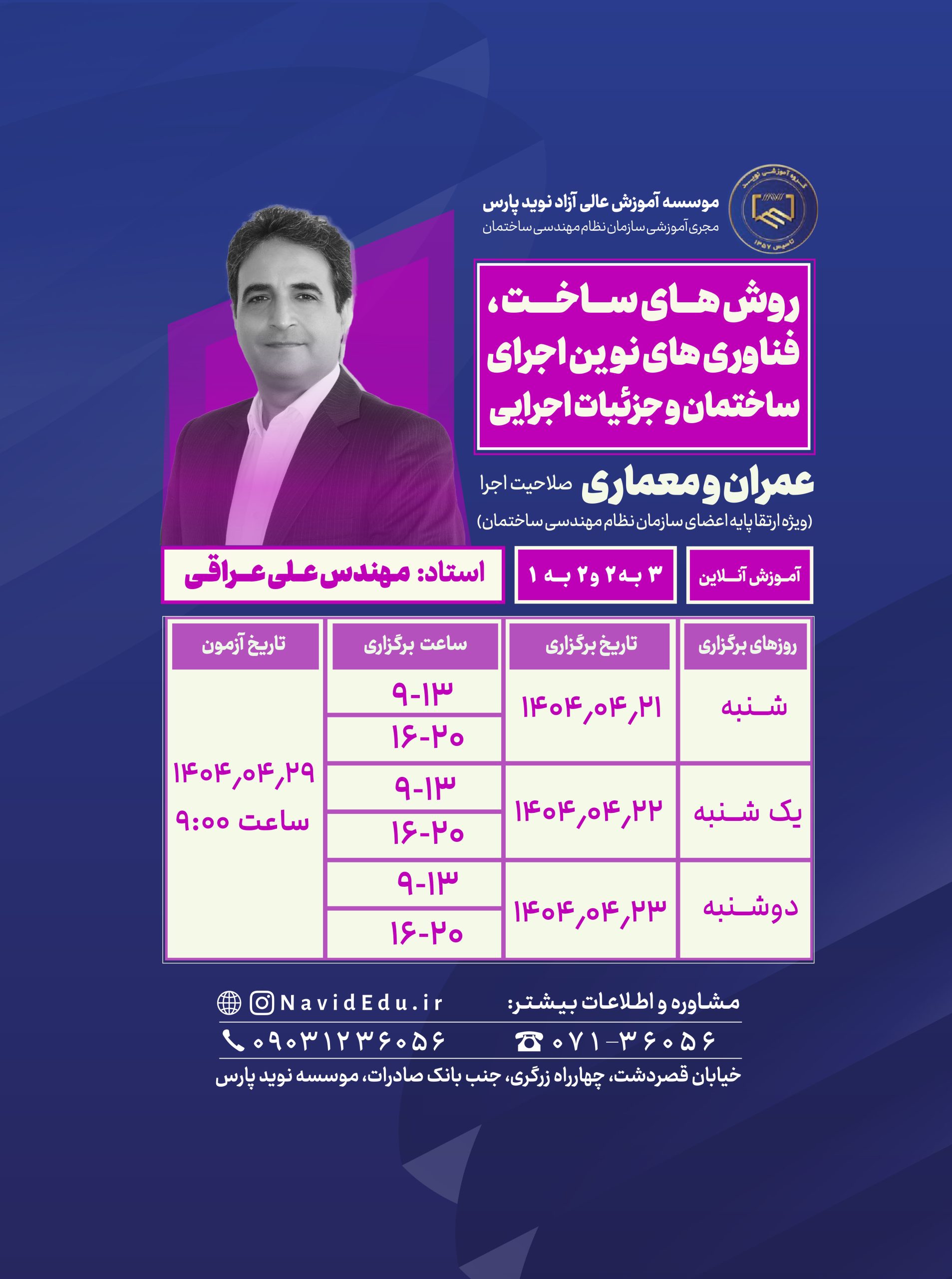 - عطف به نامه شماره ۹۳۲۷/۴۲۰ مورخ ۱۴۰۱/۰۱/۲۷ دفترمقررات ملی ساختمان و لزوم برگزاری حضوری آزمون های پایان دوره، کلاس های این دوره به صورت آنلاین و آزمون پایانی دوره مذکور به صورت حضوری و با لزوم رعایت پروتکل های بهداشت فردی توسط شرکت کنندگان (استفاده ازماسک) در محل موسسه برگزار خواهد گردید.