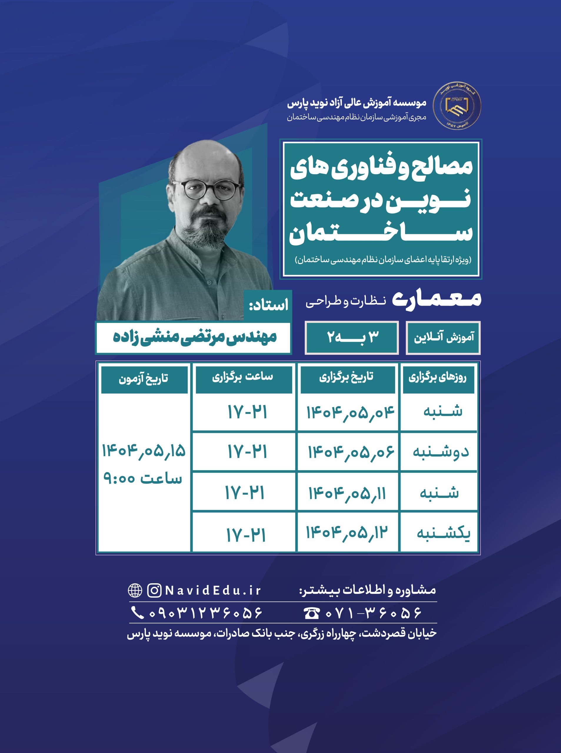 - عطف به نامه شماره ۹۳۲۷/۴۲۰ مورخ ۱۴۰۱/۰۱/۲۷ دفترمقررات ملی ساختمان و لزوم برگزاری حضوری آزمون های پایان دوره، کلاس های این دوره به صورت آنلاین و آزمون پایانی دوره مذکور به صورت حضوری و با لزوم رعایت پروتکل های بهداشت فردی توسط شرکت کنندگان (استفاده ازماسک) در محل موسسه برگزار خواهد گردید.