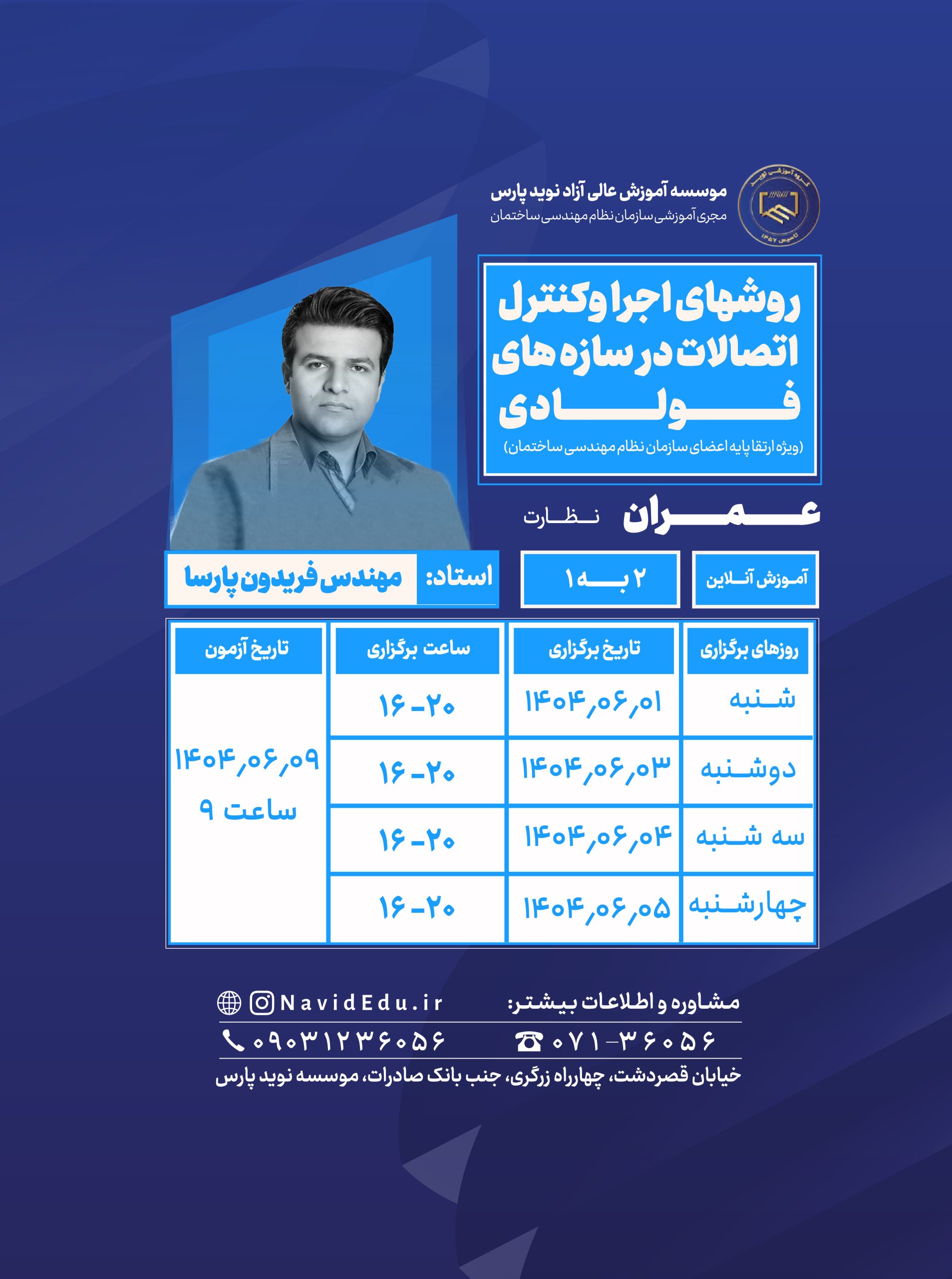 کد دوره: ۱۳۲۳۷ نام استاد: آقای مهندس فریدون پارسا تاریخ شروع: ۱۴۰۴/۰۶/۰۱ تاریخ آزمون(حضوری): ۱۴۰۴/۰۶/۰۹