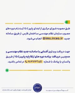 جهت دریافت ویدئوی آشنایی با سامانه جدید نظام مهندسی و همچنین دریافت برنامه دوره های ارتقا پایه پاییز ۱۴۰۴ از طریق واتساپ با پیامک با شماره ۰۹۰۳۱۲۳۶۰۵۶📞 در تماس باشید.