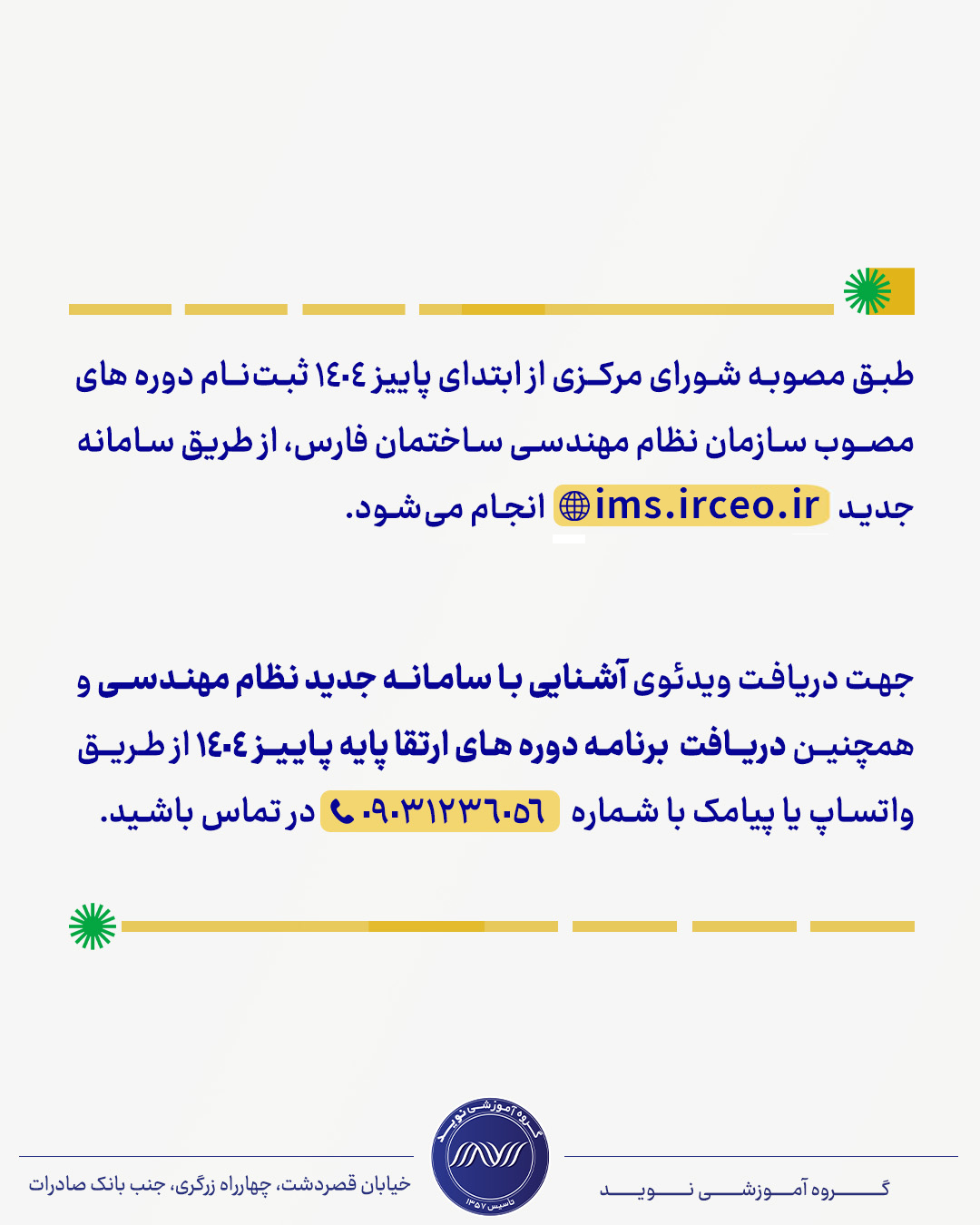 طبق مصوبه شورای مرکزی از ابتدای پاییز ۱۴۰۴ ثبت نام دوره های مصوب سازمان نظام مهندسی ساختمان فارس، از طریق سامانه جدید ims.irceo.ir🌐 انجام میشود.